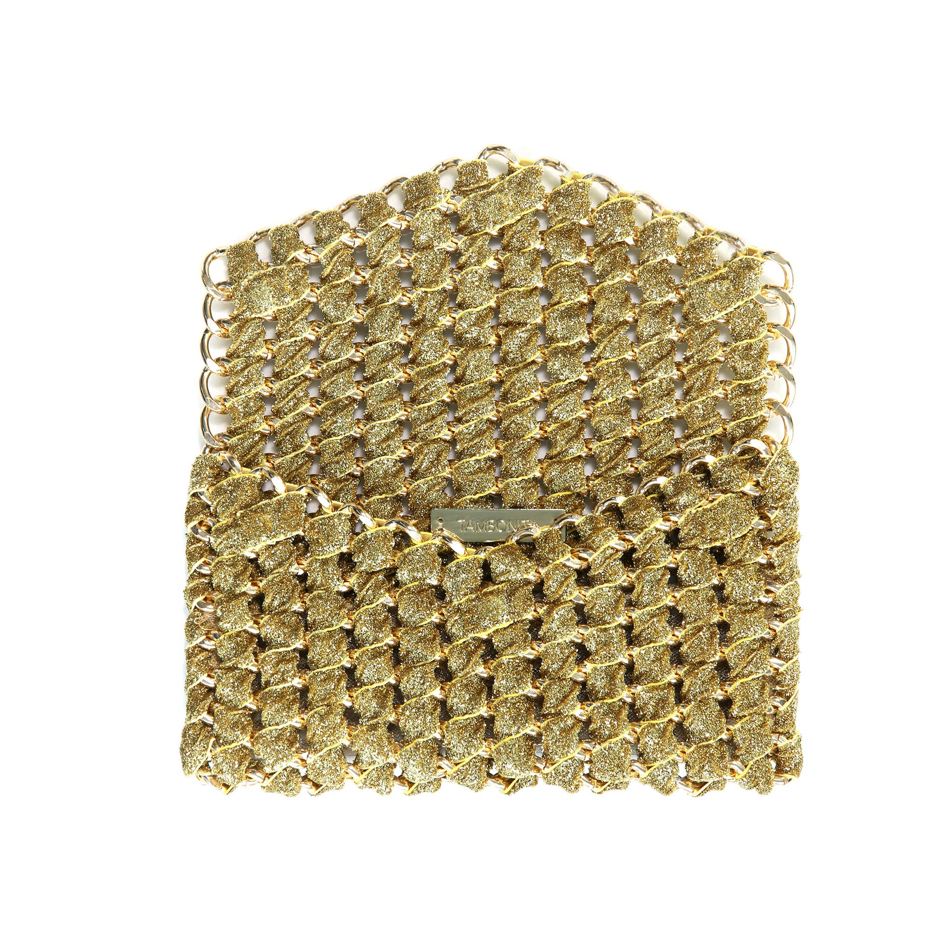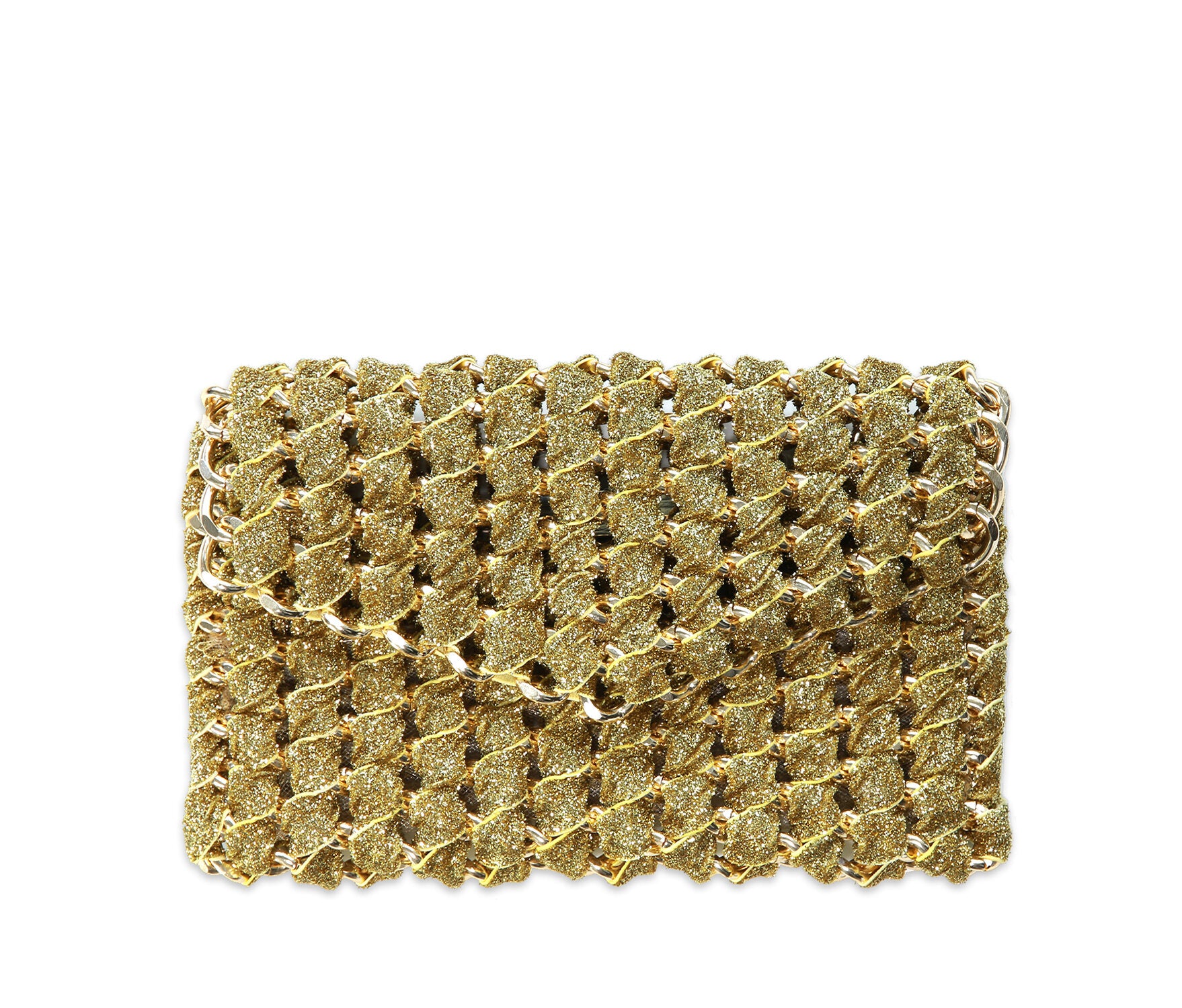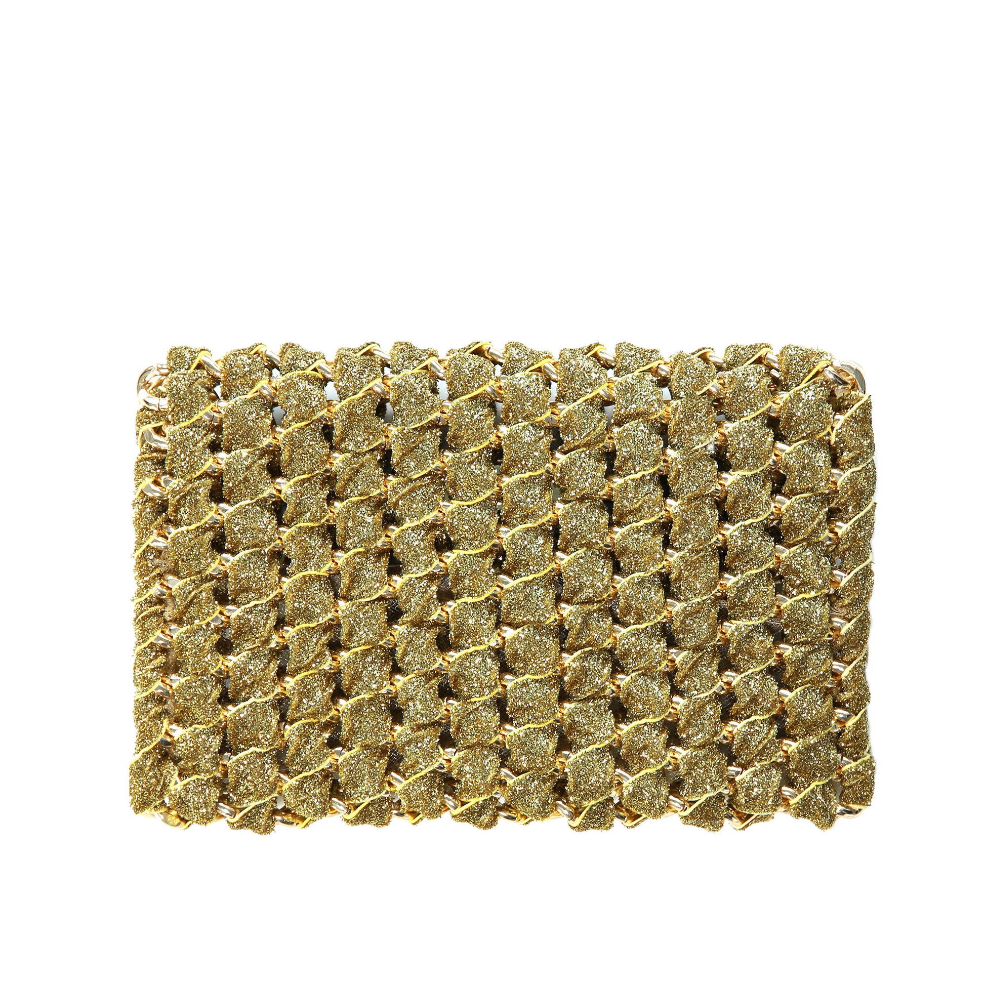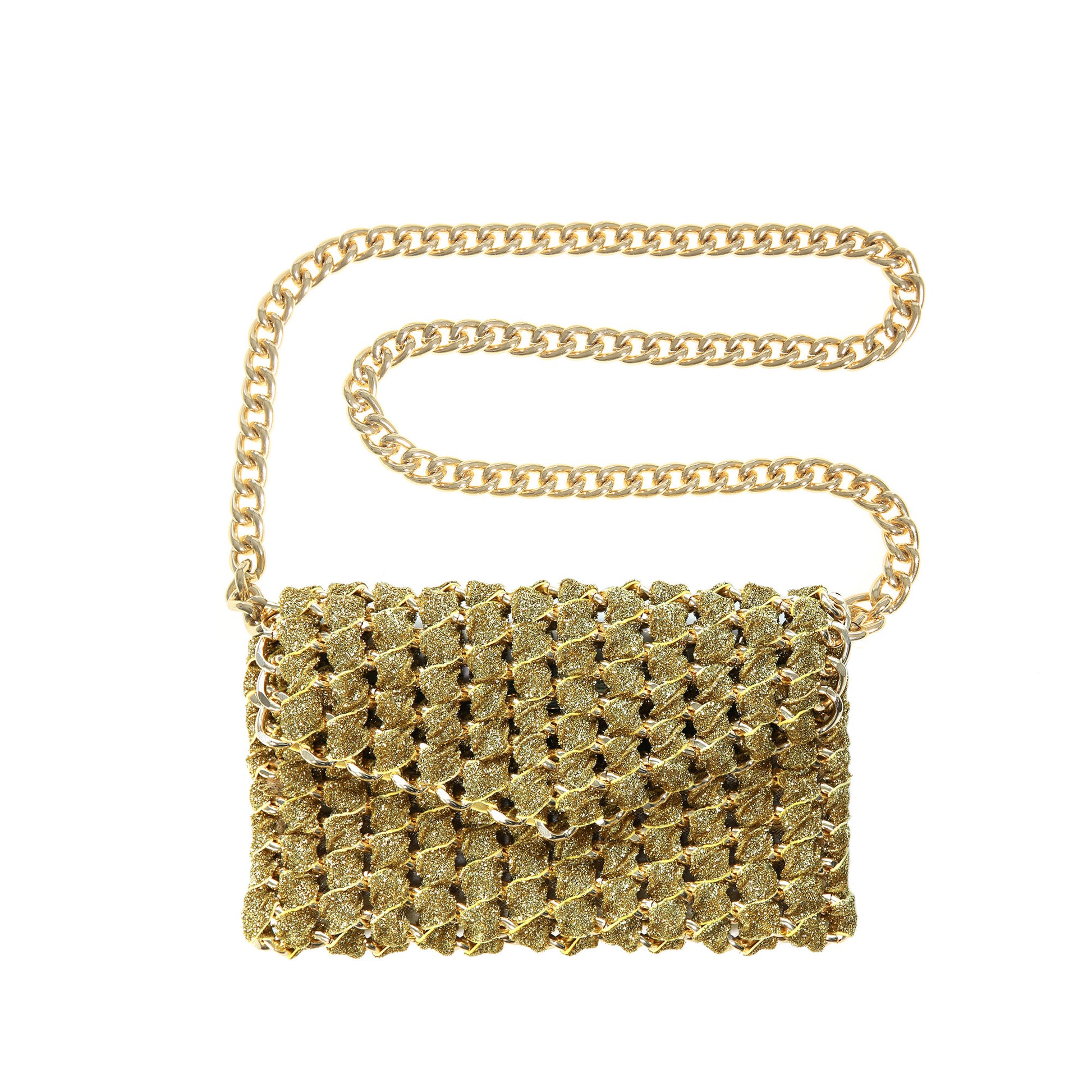 Personal favorite: The Gold Shimmer Eve is loaded with edge and bling. Perfect for transitioning from day to night, it features a magnetic closure and versatile uses. Handmade and shown here with an aluminum gold-plated chain, it’s also available in all chain colors, woven with stretch shimmer gold ribbon and mesh lining. You can order it with either a 29" strap or a 48" strap for use as a crossbody, over-the-shoulder, or clutch. It’s also available as a wristlet or with a knuckle-band option, without a chain strap.