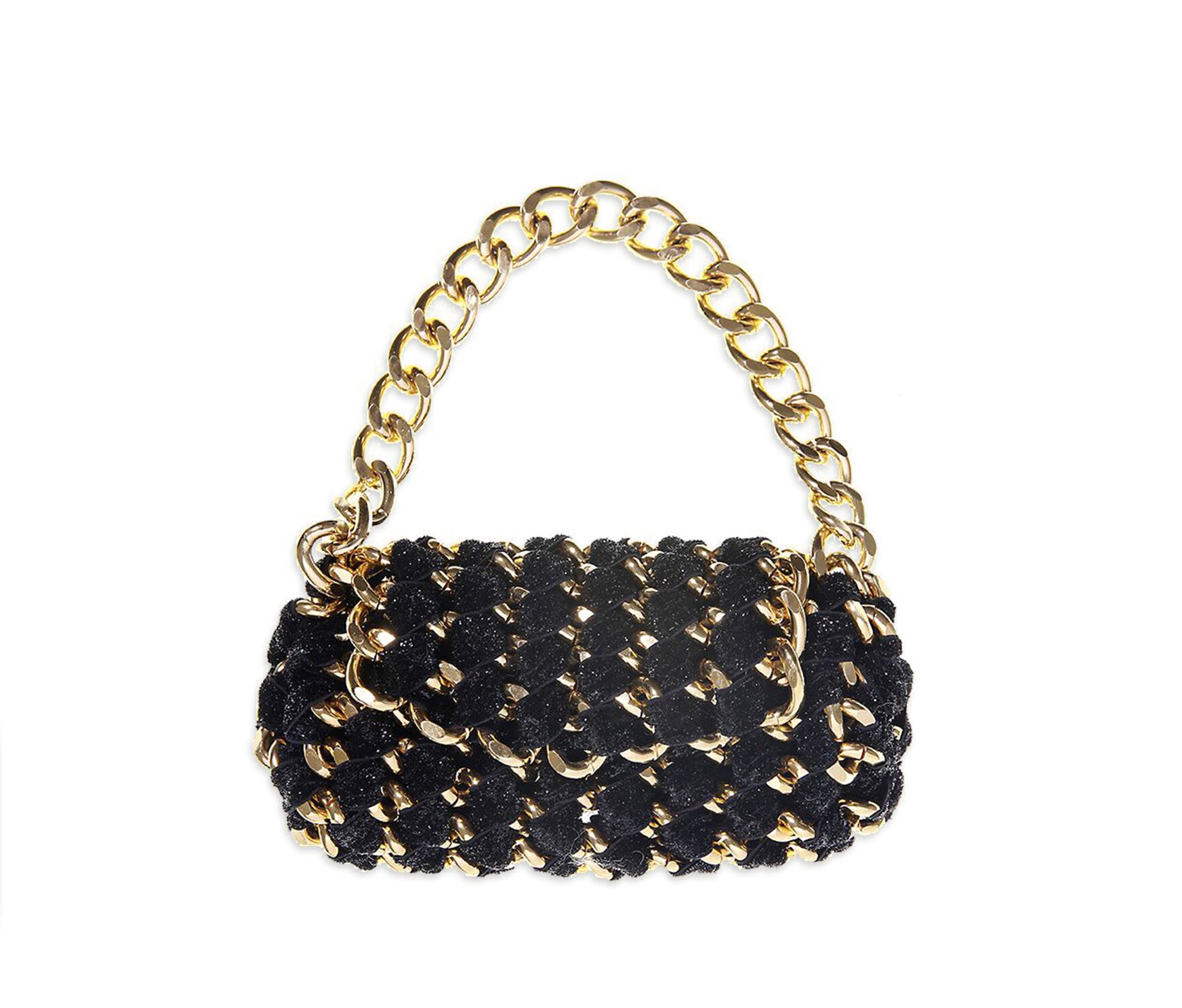 Shimmer Black Pouch with gold curb chain and magnetic closure, designed by Emilia of the Artist Collective. Made for the true romantic, yet rockin' glittery ribbons and metal swag to boot. The Pouch is retro wild yet historically correct. The best of both worlds.